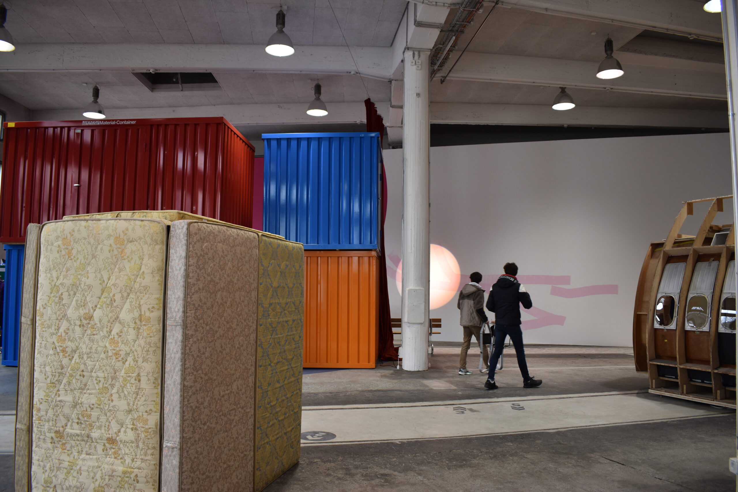 Beim mit Matratzen ummantelten Kühlschrank bleiben wir stehen. „Hier leben Milliarden von Flöhen, Kakerlaken, Läusen und Bettwanzen.“ Tobias macht mich mit den tierischen Bewohnern der „Matratzenzelle“ von Bob Gramsmas bekannt. Es juckt mich schon beim Zuhören. Ekelhaft diese alten müffelnden Matratzen. Widerwillig öffne ich, auf Anweisung von Tobias, die Kühlschranktüre und setze mich auf den Stuhl in der engen Matratzenzelle. Die klapprige Kühlschranktür rastet ein. „Auf der Mauer, auf der Lauer sitzt ne kleine Wanze“. Umgeben von Krabbeltieren ertönt dieses schreckliche Kinderlied aus den Kopfhörern. Mir ist schlecht. Dankbar für mein wanzenfreies Bett verlasse ich die „Matratzenzelle“.
